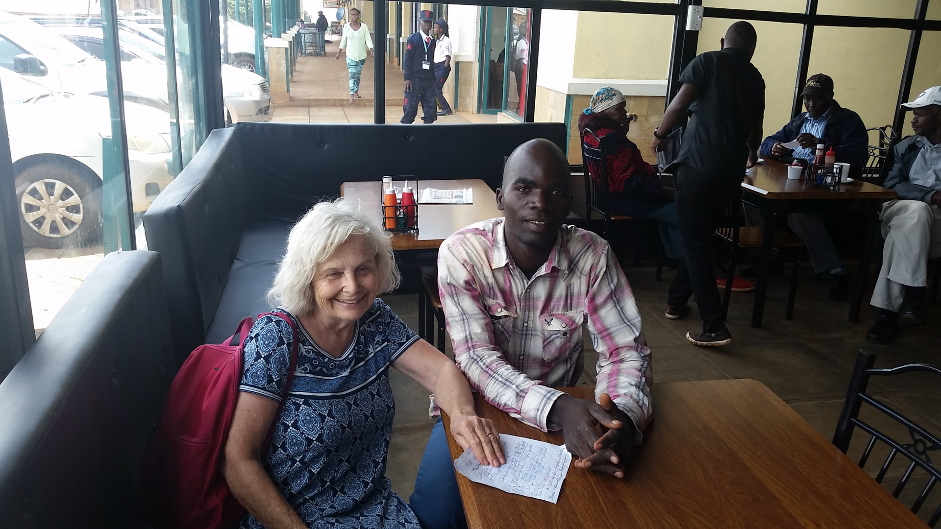 This is at a Fish & Chips restaurant in Maru. This is Linda, her and her husband Cal started "Each One Feed One" Mission in Tharaka Kenya. Next to her is Festus, he does some maintenance, he runs errands and transports people.